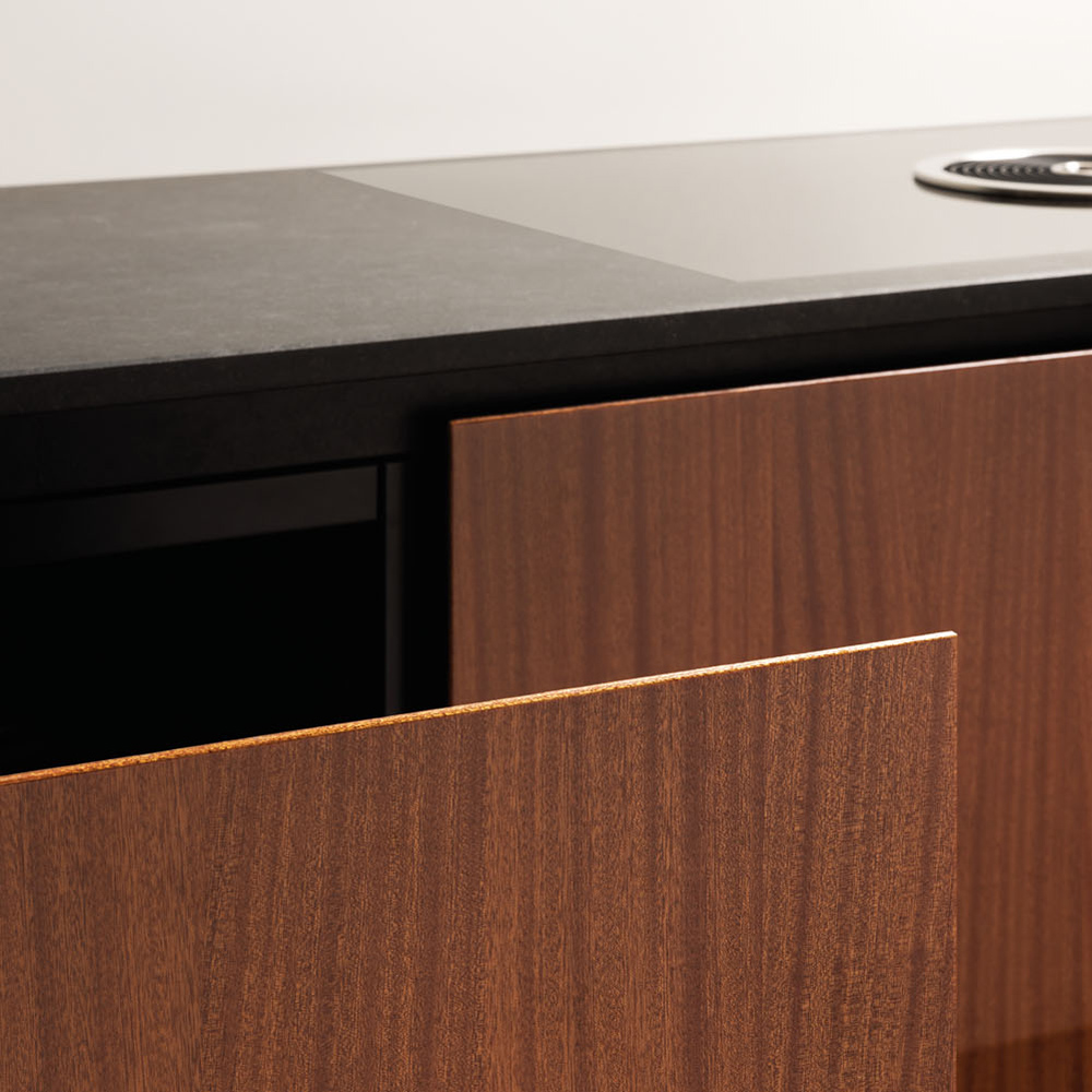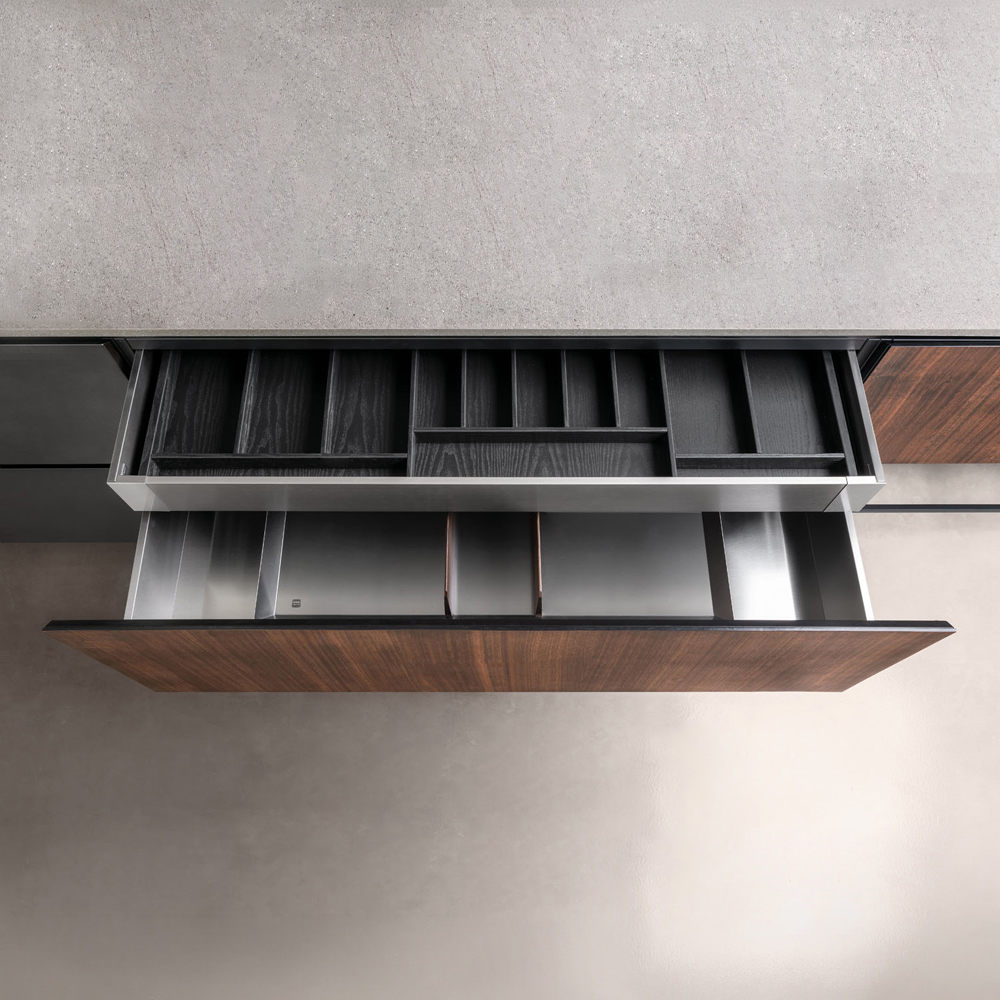 Cottura, aspirazione, illuminazione e soluzioni tecniche integrate e silenziose progettate per mantenere coerenza formale e prestazioni elevate.